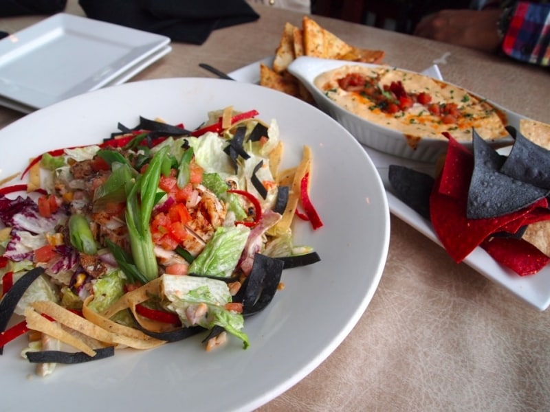 こういったスポーツグリルレストランで、注文すべきはなんと言っても「チキンウィング」。注文時には、パン粉を付けて揚げるか、パン粉なしで揚げるかを聞かれます。私たちは1lb(1パウンド=約450g)でパン粉なしのスパイシーBBQチキンをオーダー。ジューシーでピリ辛のチキンウィングはビールとの相性もばっちり。さらに私たちはチキンサラダとナチョスも注文しました。