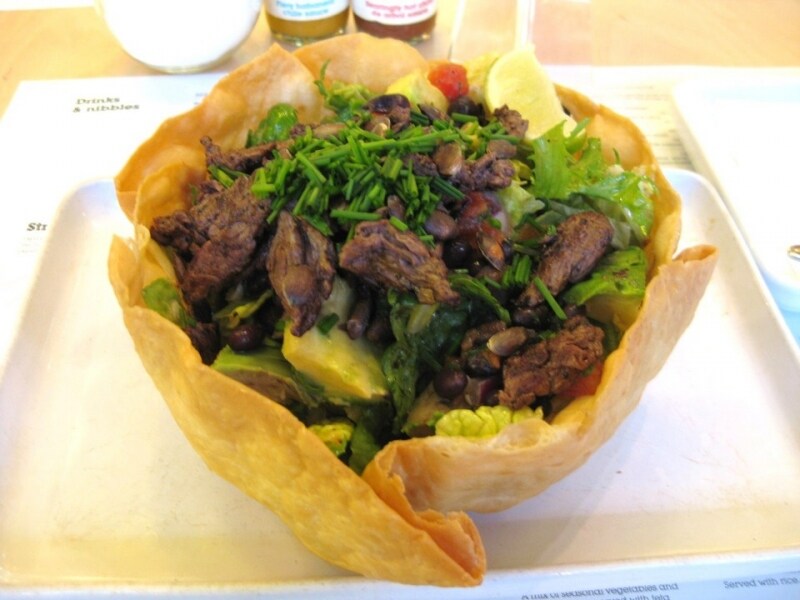 私のお気に入りは、トルティーヤの「食べられるサラダボウル」に入ったサノーラ・サラダのカットステーキのせ。生野菜とお肉、豆類や穀物、カボチャの種、アボカドなどがたっぷり入り、おいしいだけでなく、栄養バランスも抜群です。