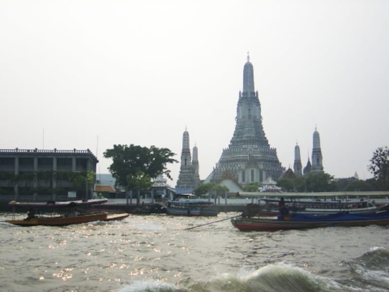 バンコクの観光に外せないお寺巡り。バンコク市街地からチャオプラヤー川を渡ったところにあるワット・アルンはバンコクにある三大寺院の一つです。ワットは寺、アルンは暁という意味。三島由紀夫の小説「暁の寺」の舞台となったことでも知られます。現在の10バーツ硬貨にも描かれています。先に書いた通り、バンコク市街地からワット・アルンへは、チャオプラヤー川を渡る舟で向かいます。ちょっとしたアトラクション気分でワクワク。料金は3バーツ(約9円)と激安です。船が行きかうチャオプラヤー川を5分ほど進めばワット・アルンの入り口に到着します。
