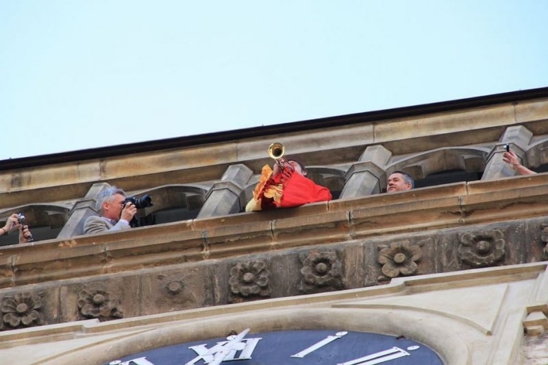 また、この時計塔は有料で上に登ることが可能で、このカラクリ時計終了後に時計台の頂上でトランペットを吹く人がいます。頂上の観客、下で見ていた観客がそのトランペット奏者にエールを送るといつも以上にトランペットが盛り上がります。