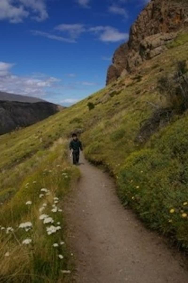 町の中心部から徒歩20分ほどで、フィッツ・ロイが見える展望台に続く登山道の入口に到着。簡単なハイキングの格好で、私たちは子連れプチ登山です。が、道は歩きやすく整備されていて、3歳児でも難なく進めます。ところどころ小川があったり、少し急な段もあるけれど問題ありません。山々に咲き乱れる可愛い野花を眺めながら、楽しく歩きすすめられます。なかなか見えない名峰