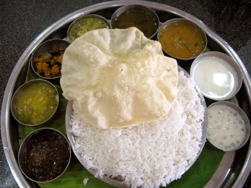 さらに「ポリヤル」という野菜の炒め蒸しや「クートゥ」というココナッツミルク風味の野菜の煮物、「ライタ」というヨーグルト風味のサラダも定番。そのほか箸休め的存在として、ほんのり塩味でパリパリの薄焼き煎餅のような「パパド」やピクルス、「チャトニ(チャツネ)」などもおなじみ。またライスにも「ポディ」と呼ばれるスパイスや豆を砕いたふりかけや、「ギー」というバターに似たオイルをふりかけて食べたりします。