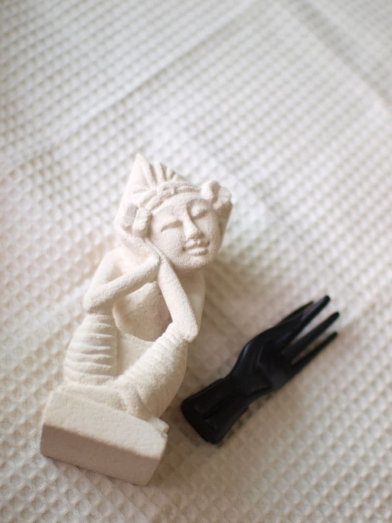 女性の像は、バスルームに。ふと見るたび、ピースフルな表情になごんでいます。手の置き物は、アクセサリー置き場に。大切な指輪を親指の部分に引っかけてディスプレイしています。