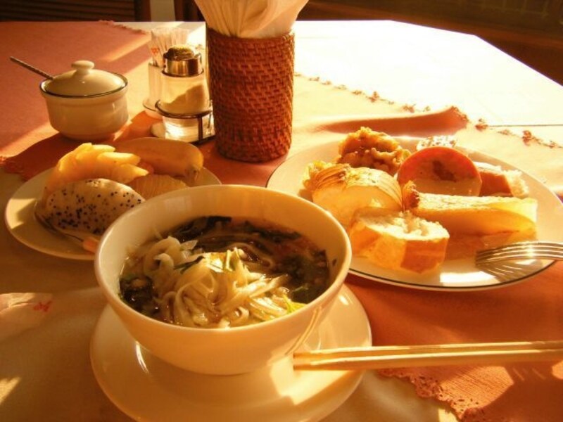 朝食はホテル9Fにあるレストランでバイキング形式でいただきます。パン、フルーツなどのほか、おかず的なものやできたてのフォーなど、メニューは多かったです。