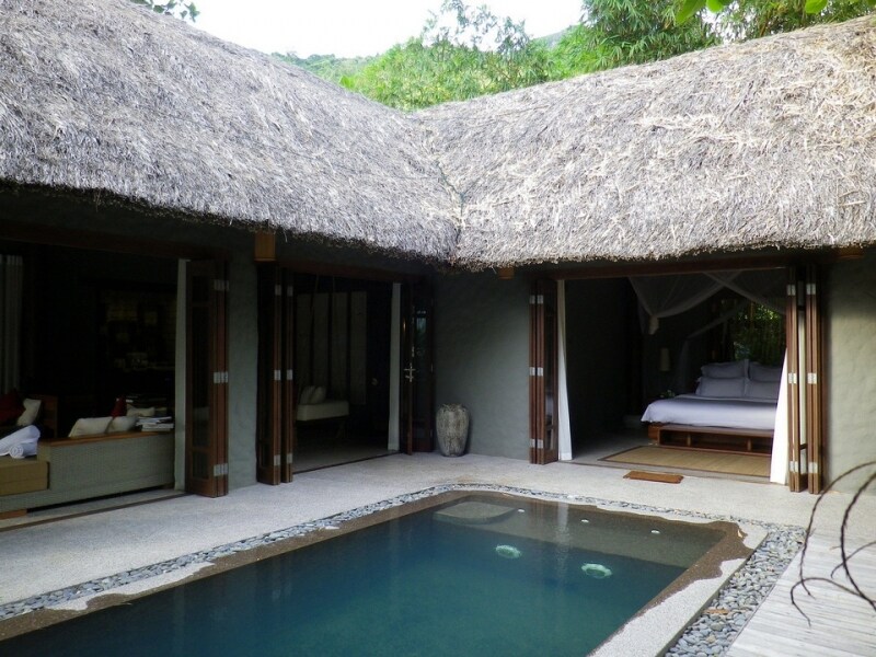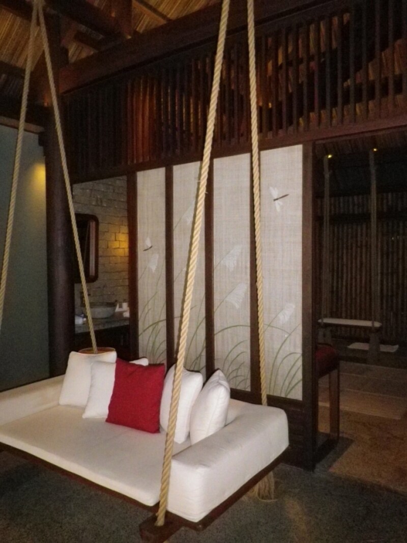 自然と調和のとれたそのホテルは、全室プライベートプール付きのヴィラタイプで、広い室内にはブランコもあり、開放的でお洒落です。