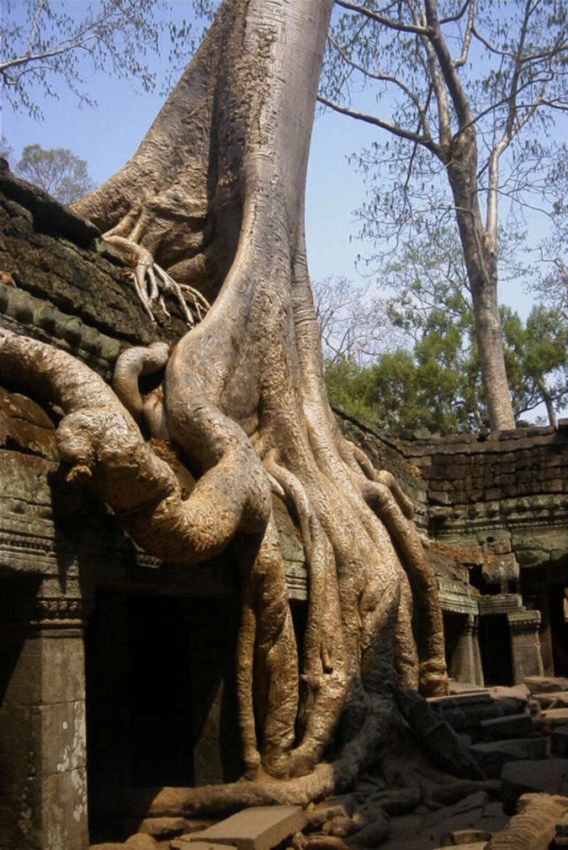 スポアンの根が、石の壁の隙間に入り込み、壁を這う大蛇のような姿になっています。人工の物と自然の物が共存しているというより、自然の脅威・猛威に建造物が圧倒され、神聖であるはずの宗教施設が廃墟と化しています。