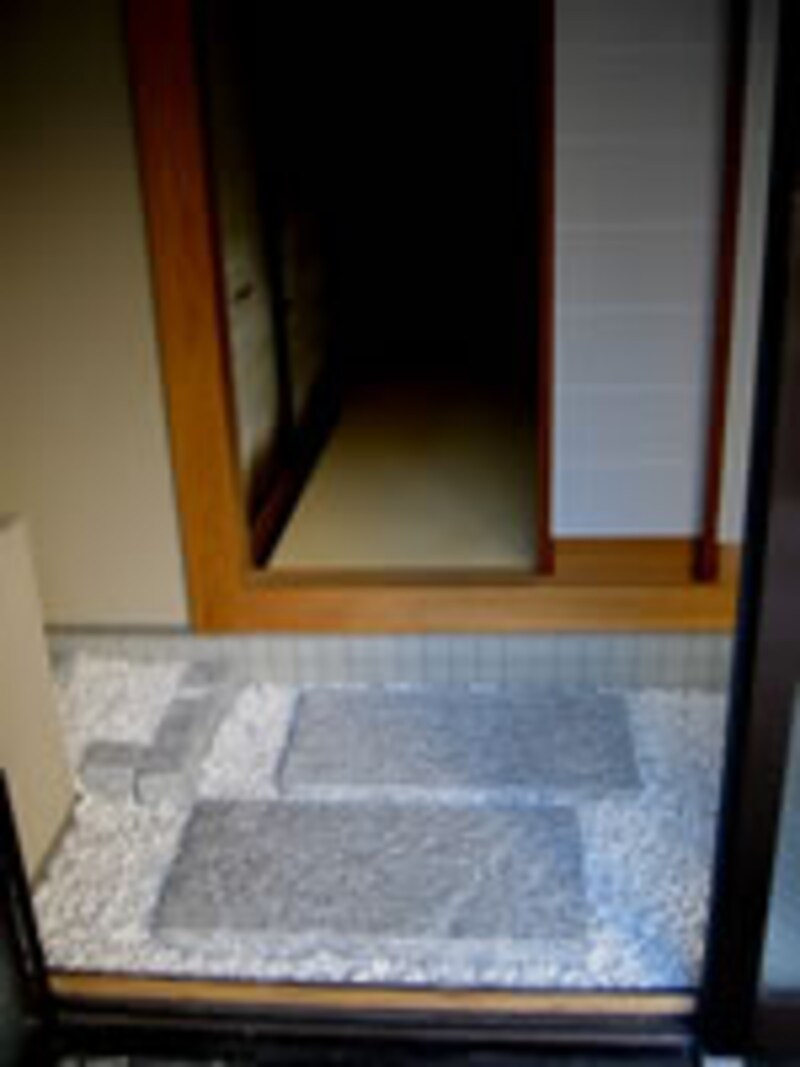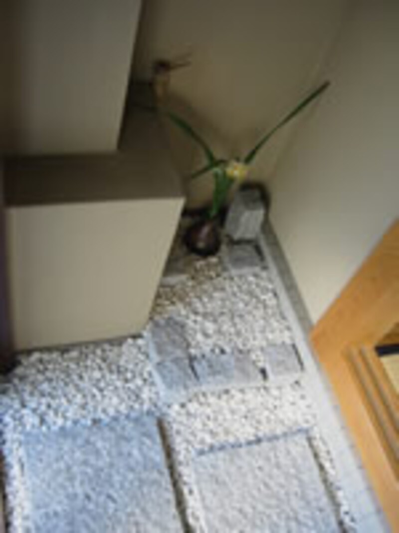 下町のとあるマンションの1階に高田氏の住まいがある。さっそくアルミサッシの引き戸を開けると、其処に忽然と現われるのが白御影の跨ぎ石(またぎいし)を配した異次元空間が目に飛び込んできた!!
