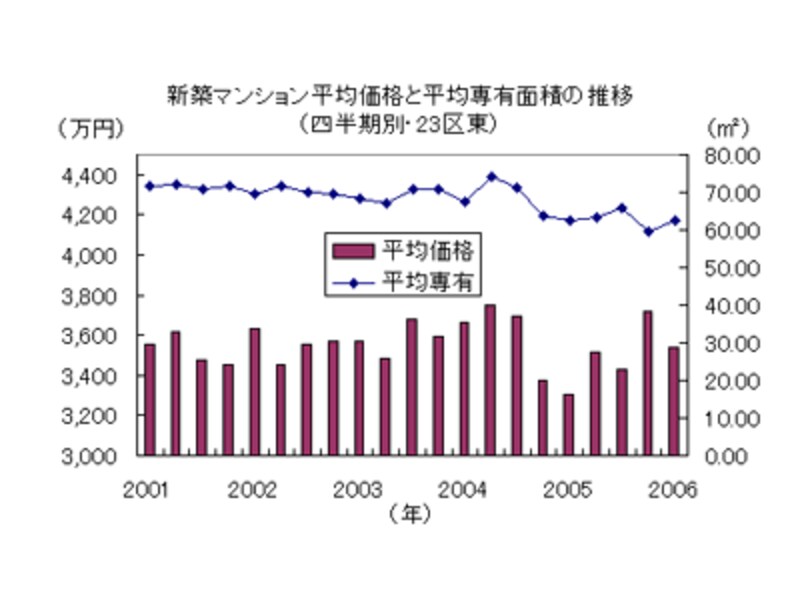 このエリアの平均価格をみると、2006年1月~3月期は3,541万円でした。それまでの推移をみると、四半期ごとに多少のブレはあるものの、おおむね3,000万円台の半ばでの動きが続いています。最も高い時期で3,700万円台、低い時期で3,300万円台と、時期による価格の幅もさほど大きくはありません。他のエリアでは時期によって1,000万円単位で平均価格が変化することが少なくありませんが、このエリアでは様相が異なっています。 「23区の東エリアでは、初めて購入する人向けの物件がほとんど。それもディンクスや3人家族など小さめの物件が多く、全体として価格が低く抑えられる傾向が強いのです」(東京カンテイ市場調査室室長・中山登志朗氏)逆にいえば、グレードを高くしても売りにくいという面があるため、落ち着いた動きになっているとも考えられます。23区で初めての購入を目指す人にとって、このエリアが最も手に入れやすい状態が当分は続きそうです。