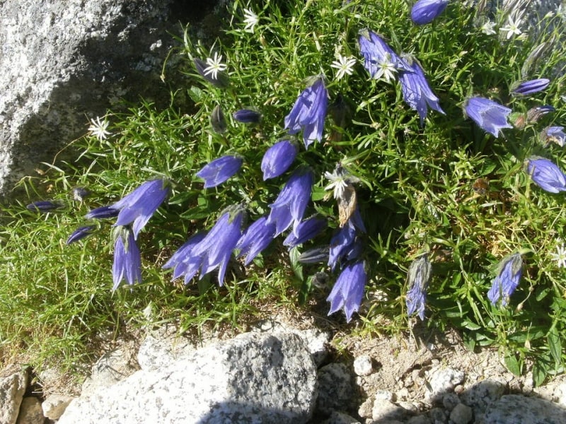 千畳敷カールは高山植物の宝庫として知られ、7月から8月にかけてチングルマ、ミヤマクロユリ、コバイケイソウ、シナノキンバイ、ミヤマキンポウゲなどさまざまな高山植物の花が咲き乱れ、お花畑となります。また、登山道を登って稜線上に出ると、チシマギキキョウ(写真)や「高山植物の女王」とも称されるコマクサ、木曽駒ケ岳周辺にしか生息しないヒメウスユキソウなど、千畳敷カールとは違った花々が見られます。稜線上に出るだけなら、さほど時間はかかりませんし(片道約1時間)、景色も千畳敷カールから見上げるのとは全く違うので、余裕があればぜひ登ってみることをおすすめします。■千畳敷カール