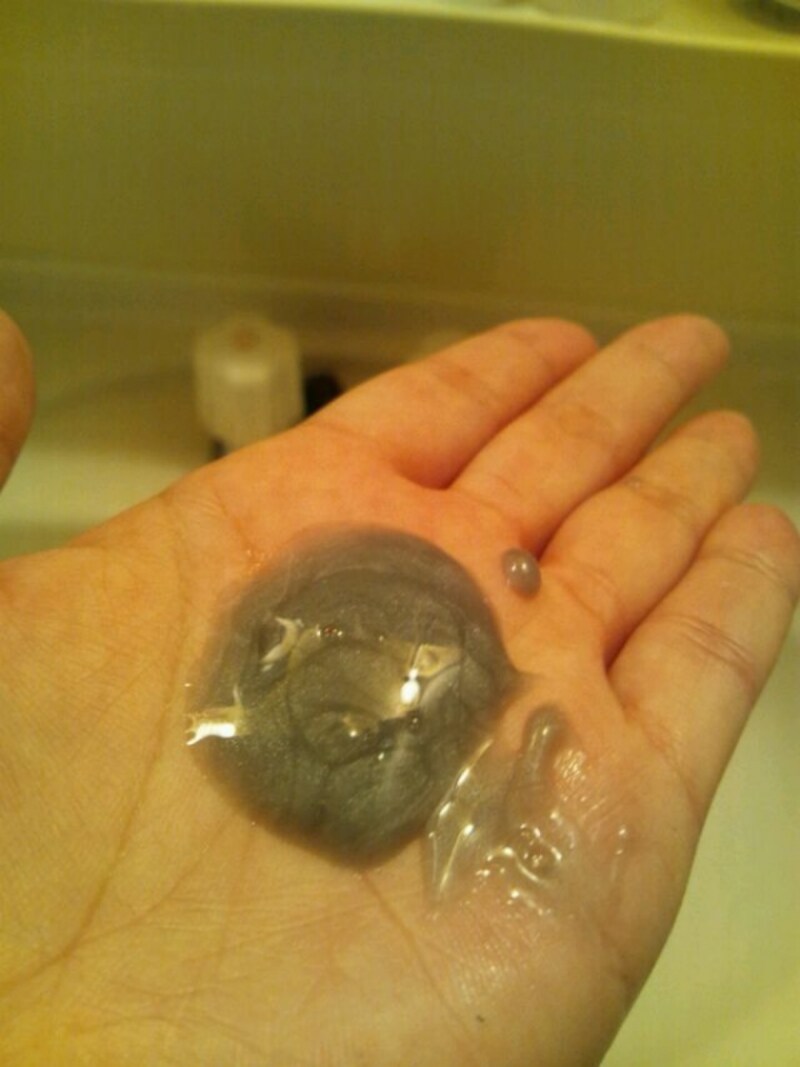 手に出してみてすぐはとろみとツヤのある黒みがかったジェルですが、