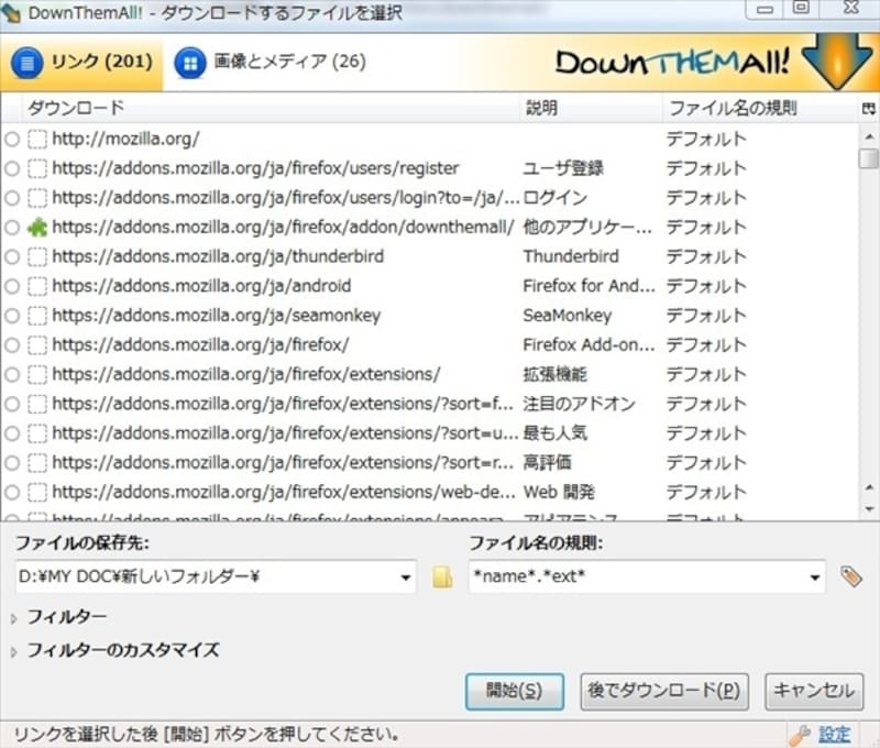 公式サイト:https://addons.mozilla.org/ja/firefox/addon/downthemall/