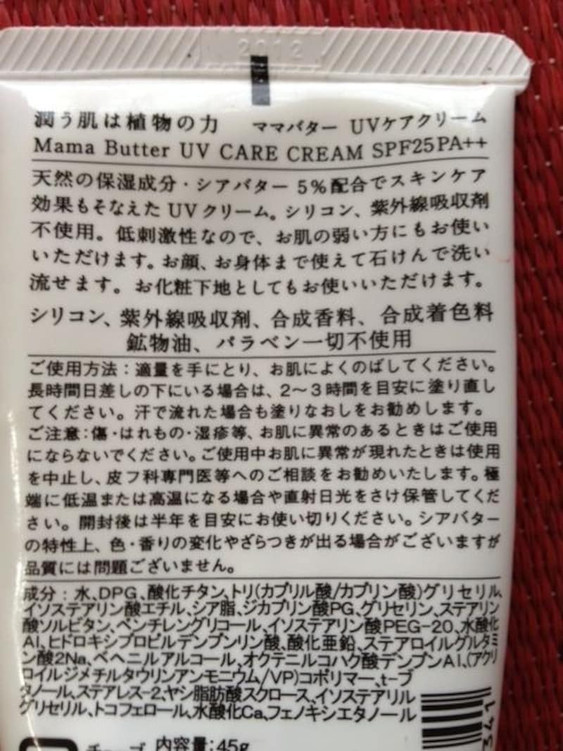 お肌につけるものは、できるだけオーガニックに近い製品を選ぶようにしています。ママバターのUVケアクリームは一般的なUVケア商品に配合されることの多いシリコン剤・紫外線吸収剤・合成香料・合成着色料・鉱物油・パラベンを全く使っていません。天然のシアバターも6%含まれていて、お肌の乾燥を防ぎ、美容効果もあります。