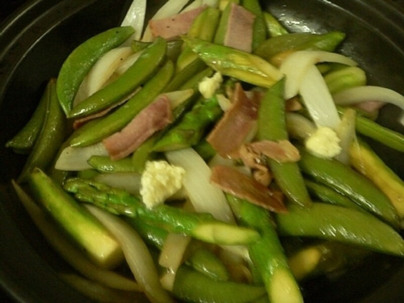 1.スナップエンドウはスジをとる。アスパラは根元5cmほど皮をむいて、スナップエンドウの長さの斜め切り。玉ねぎはくし型切り。ベーコンは1cm幅に切る。2.タジン鍋に1を入れ、オリーブオイルとワインをふりかけ、塩コショウし、蓋をして中火にかけ、ピチピチ油がはねる音が聞こえてきたら弱火にして蒸し焼きする。