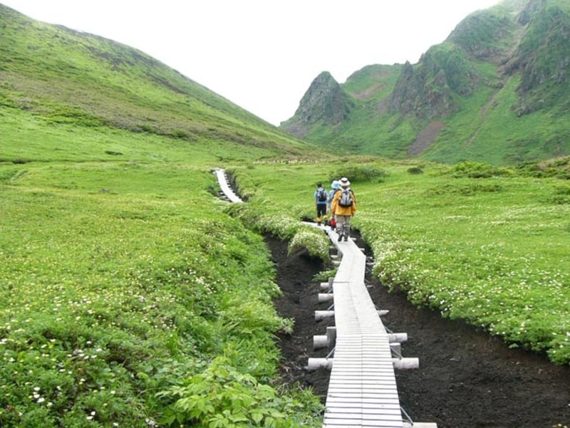 美しい高山植物に彩られた秋田駒ヶ岳をトレッキングするツアー。ゆっくりとしたスピードで自然の中を進んでいくので、小さな花を見つけられたり、思わぬ絶景ポイントに出会えたりするのが魅力です。ルートは8合目(1400m~1500mくらい)までバスで向かい、そこから1637mの山頂を目指します。高低差があまりないので初心者でもチャレンジしやすくなっているのがポイント。