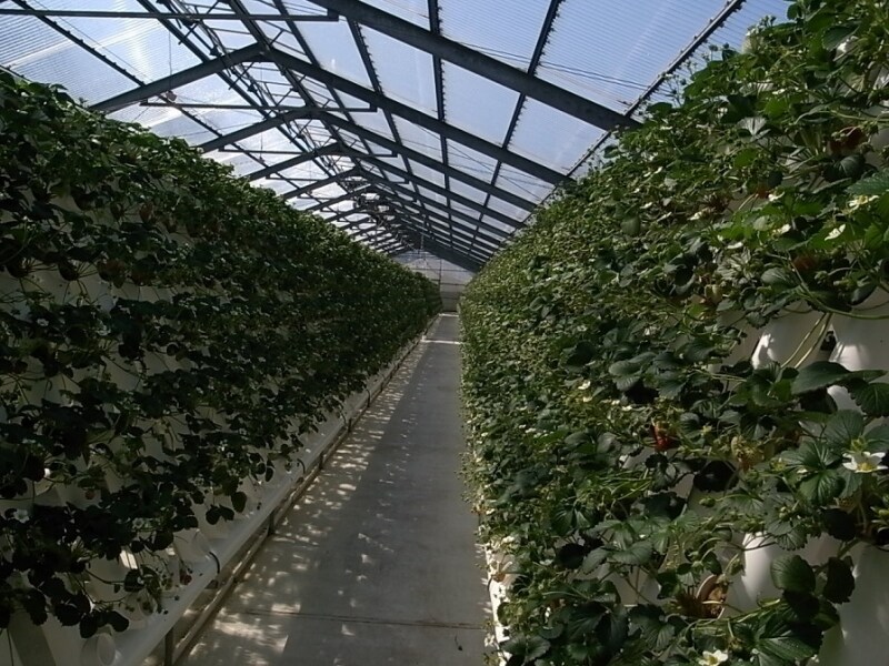 立体型7段式水耕栽培なので、座り込んで摘むよりも疲れることはありません。目線の高さにいちごがあるので、完熟しているのを見分けやすいのもうれしいです。また、床面は土ではなく通路となっているので、車いすの人でも安心して楽しめます。