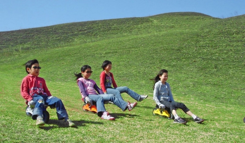 ふたつ目は、ポッカール体験です。ドイツのエンジニアと医師により開発された、新感覚のスポーツギアだそうです。日本ではあまり聞きなれないスポーツですが、ヨーロッパでは、ワールドカップが行われているほどメジャーなスポーツなんだそうですよ。ミニバイクとソリの間のような乗り物で草原を疾走するのですが、ただ重力にまかせて滑り落ちるだけではなく、ハンドルやブレーキで方向や速度を調節できるので、大人もハマってしまいそうな楽しい体験プログラムです。