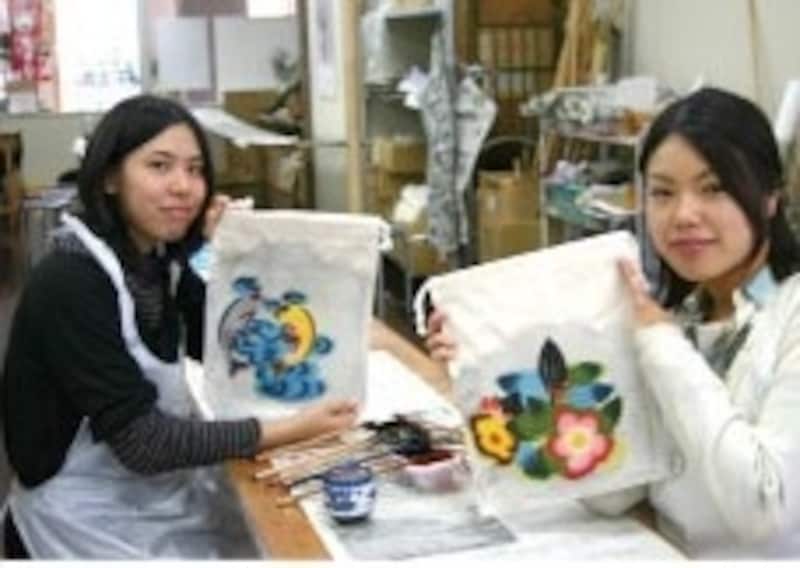 「那覇市伝統工芸舘」では、型置きがすんでいる布に好きな色を塗っていきます。色が塗り終わったら、3日間寝かせ、裏からアイロンをしっかりあて、50度くらいのお湯につけおきして、糊を落とすと完成です。