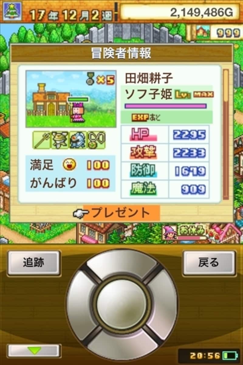 今まで紹介した冒険者をサポートする機能はわりと間接的な方法でしたが、実は個別で冒険者を支援することができます。例えば、お金のない冒険者に買った装備をプレゼントしてあげたり、アイテムを使ってステータスを上昇させたりなどです。これらのプレゼントで冒険者の育成を手伝えば、冒険者はさらに期待に応えてくれるようになります。そして、活躍した冒険者には勲章をあげることが可能です。