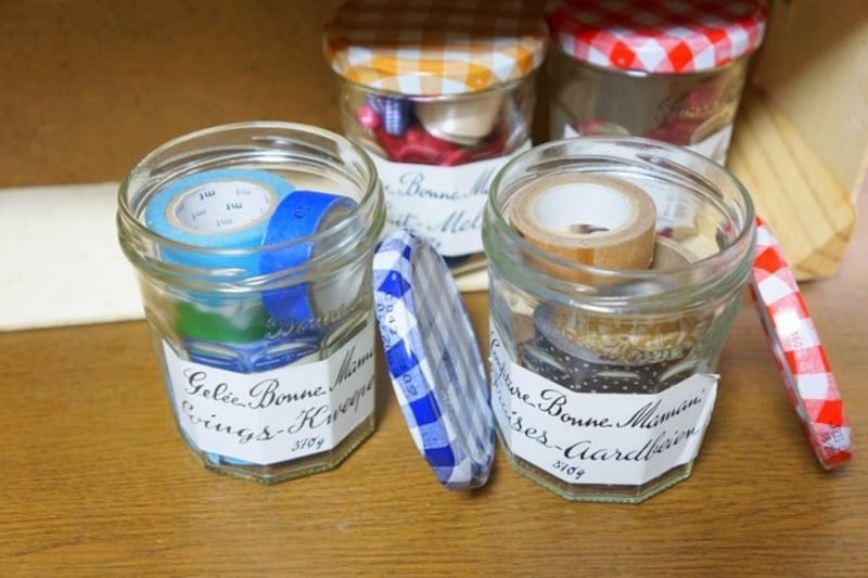 そして、その蓋の色に合わせて趣味や仕事で使う小物を収納しております。青色の蓋の瓶には青系のマスキングテープ、ピンク色の蓋の瓶にはピンク系のマスキングテープを入れ、ほかにも端切れやプレゼントについていた短いリボンを丸めて入れております。