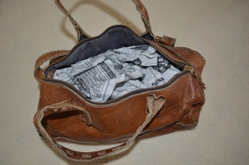 バックにもいろいろな形がありますが、柔らかい素材のものは型崩れしないように新聞紙をくしゃくしゃにしてバックの中に詰めて収納しています。