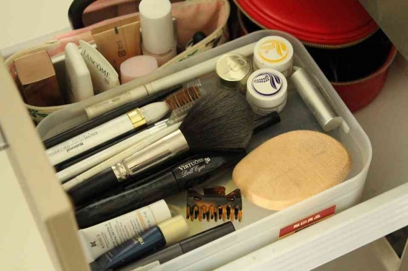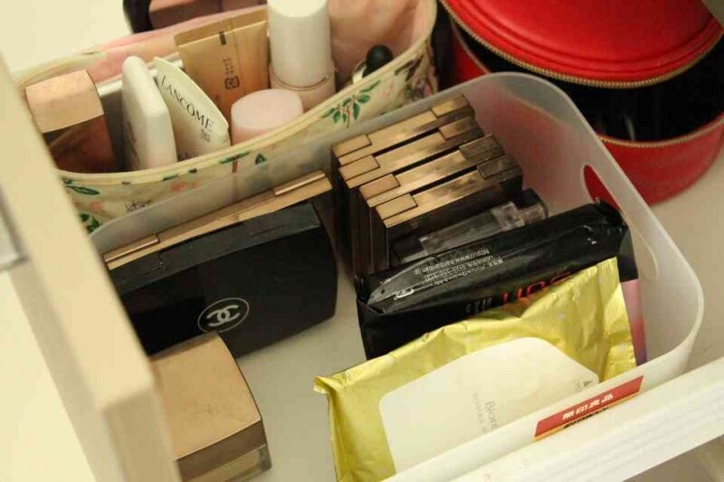 上のメイクトレ―にはマスカラやアイライナー、化粧品のサンプル、パフなどを入れて、下のメイクボックスにはチークやアイシャドウ、ファンデーションなどカラーアイテムを入れています。重ねておけば、さっと違う場所に持っていきメイクをすることだってできるのでとても便利です。