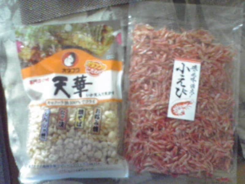 「イカの姿フライ」「かっぱえびせん」で代用してもOKですが、今回は正攻法ということで、私が働いていたお店でも使っていた「いか入り天かす」「小エビ」を使います。意外に100円ショップではよく見かけます(写真2枚目参照)。なお、この場合はだしの素などが必須です。トッピングにかつおぶしを使うなら、昆布だしがおすすめです。