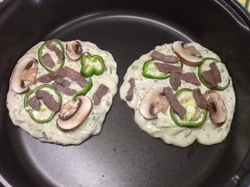 - 生地を丸く流し込み、その上に炒めた牛肉・マッシュルーム・ピーマンをのせて焼きます。裏面がきつね色になったら裏返してしばらく焼きます。