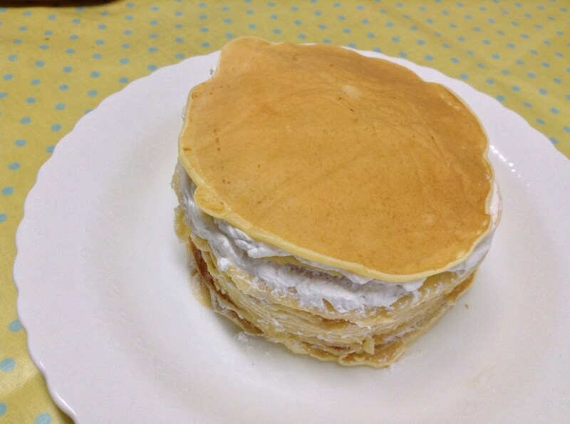- お皿に2.を1枚のせ、3.の生クリームをのせ、これを生地分繰り返して生クリームをサンドします。