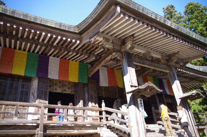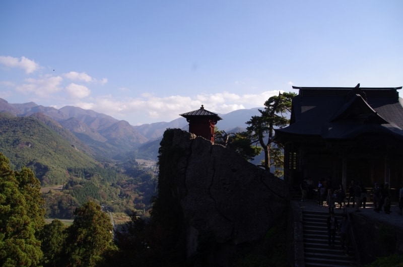 根元中堂を見学し、山門から1015段の階段を上ると開山堂と五大堂があります。ここからの眺めは格別です。ぜひ山門付近で山形名物「玉こんにゃく」を食べてから登ってください。