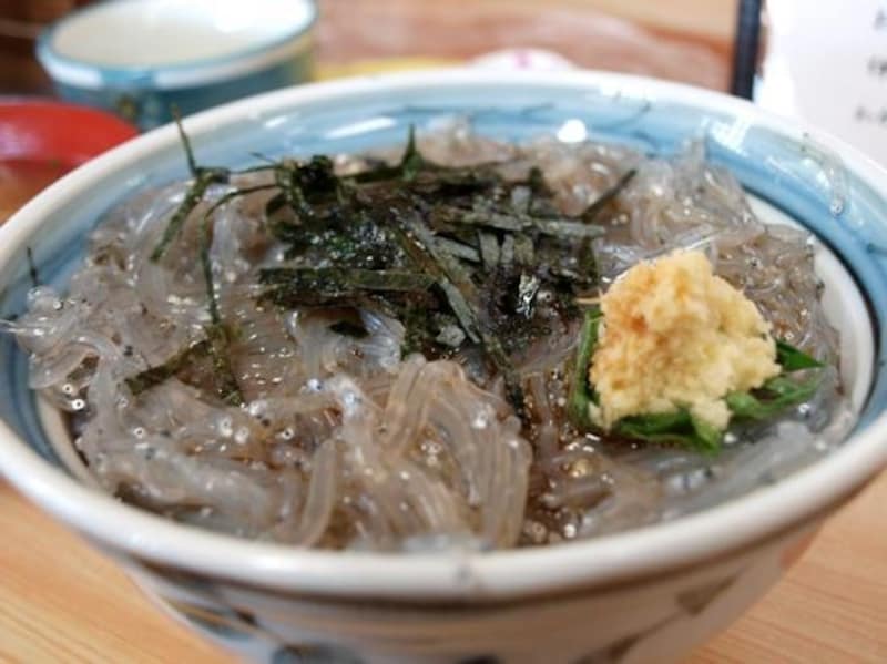 新鮮なしらすは生でいただけます。口の中に入れた瞬間、「とろ~り」と溶けていき、ショウガや大葉、ネギなどの薬味との相性バッチリ。