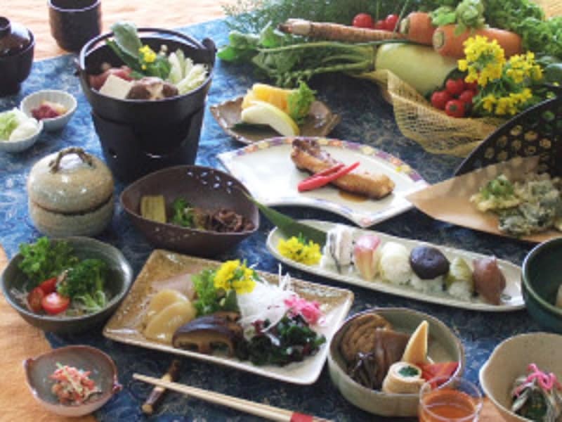 食事もまた「霧の郷たかはし」の自慢です。朝と夜の温度差が生み出す地元の高原野菜をふんだんに用いた和風創作料理が評判。熊野の山の幸、川の幸、近海の幸を使用した料理が並びます。