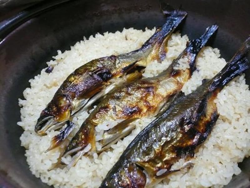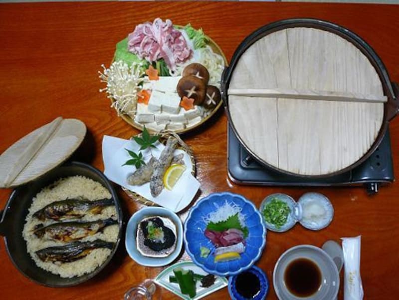 夕食の楽しみは、名物の鮎めし。目の前の日置川は、鮎の川として有名で、その鮎を使って、鮎のかおりが引き立つ炊き込みご飯を出してくれます。その他、温泉で豆腐や季節の野菜を炊く温泉鍋も評判です。