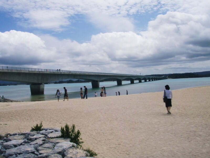 この橋は、今帰仁村の古宇利(こうり)島と名護市の屋我地(やがじ)島を結ぶ長さが1960mの橋で、無料で通行できる橋の中では長さ日本一だそうです。また、平成17年に開通するまでは、本島との行き来は船だったそうです。便利になりましたね。