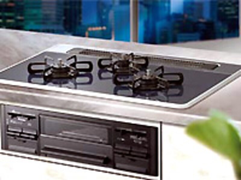 | 耐熱結晶化ガラスを採用しているため熱や衝撃に強く、お手入れもかんたん。汁受け皿が無いので、さっと拭くだけでOK。(フリーセレクションシリーズ ¥165,900 工事費別/パロマ) |