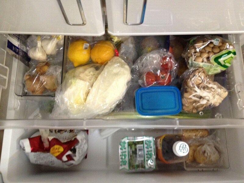 常備野菜のたまねぎ、にんじん、じゃがいも(右奥)や餅米は奥の方に見えるように入れてあります。緑の濃いモノ〈ほうれん草・ピーマンなど〉(左側)、それ以外〈かぼちゃ・なす・もやしなど〉(中央)というように、自分のわかりやすいイメージで分類して位置を決めています。