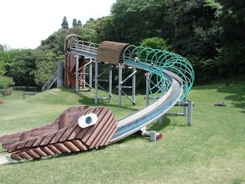公園内にある施設で圧倒的な人気を誇るのが、本格的なゴーカート場と、「冒険の谷」にある恐竜型アスレチック。こちらの恐竜型アスレチックはなんと実物大なのだとか。木製遊具としては、国内でもトップクラスの大きさです。「冒険の谷」だけでも、一日たっぷり楽しめます。