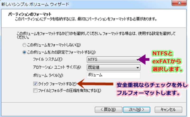 パーティションスタイルは2TB以下なら現在主流のMBRを選択するのが無難ですが、それより大きい容量にはGPTを選択する必要があります。GPTは2TB以下にも対応しますが、互換性にまだ不安があります。 - OKをクリック。ディスク管理画面の「未割り当て」と表示されている部分を右クリック→「新しいシンプルボリューム」を選択→次へ→次へ→次へ→「パーティションのフォーマット画面」が表示される(画像2)。ここで「クイックフォーマットする」にチェックが入っていますが、安全を期するならチェックを外し、フルフォーマットした方が初期不良のチェックもできます。但しフルフォーマットは一般的に時間が非常に長くかかります。(2TBなら半日はみておいた方が良い)