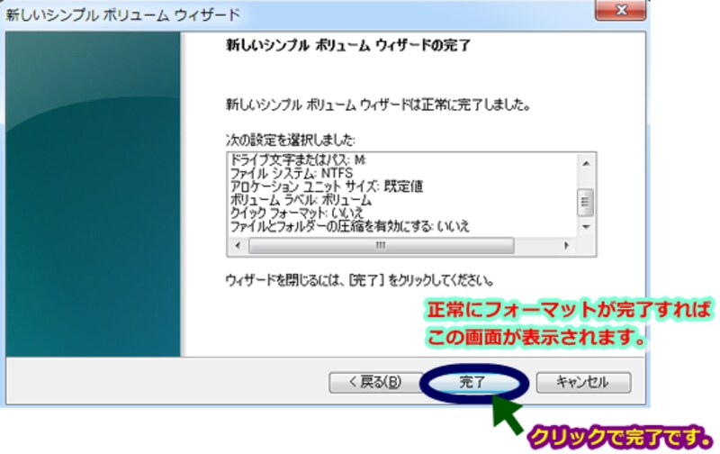 一方クイックフォーマットはすぐに終わるので通常はこちらを選ぶと思いますが、少し悩ましいところです。またファイルシステムはこの画面でNTFSとexFATが選べます。exFATは新規格で大容量ファイルに対応できる等の利点がある一方で以前のOSとの互換性が下がります。したがって一般的にはここでもNTFSを選択しておいた方が無難ではあります。 - 次へをクリック→フォーマット開始→ウィザードの完了画面(画像3)が表示される→完了クリックで終了