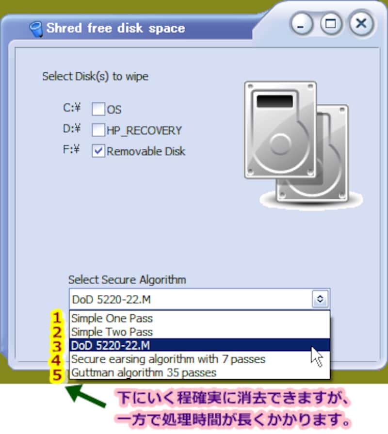 - 消去のアルゴリズムは5種類(復元のされにくさと、かかる時間のバランスで)から選択可