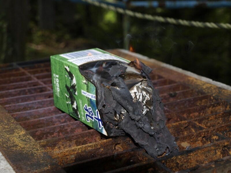 あとは牛乳パックが燃え尽きるのを待つだけ。適度にパンに焦げ目も付き、チーズもとろけたホットサンドが出来上がりです。