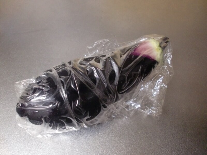 - 茄子はがくの部分をちぎり、竹串で数箇所穴を開けて、直接ラップで