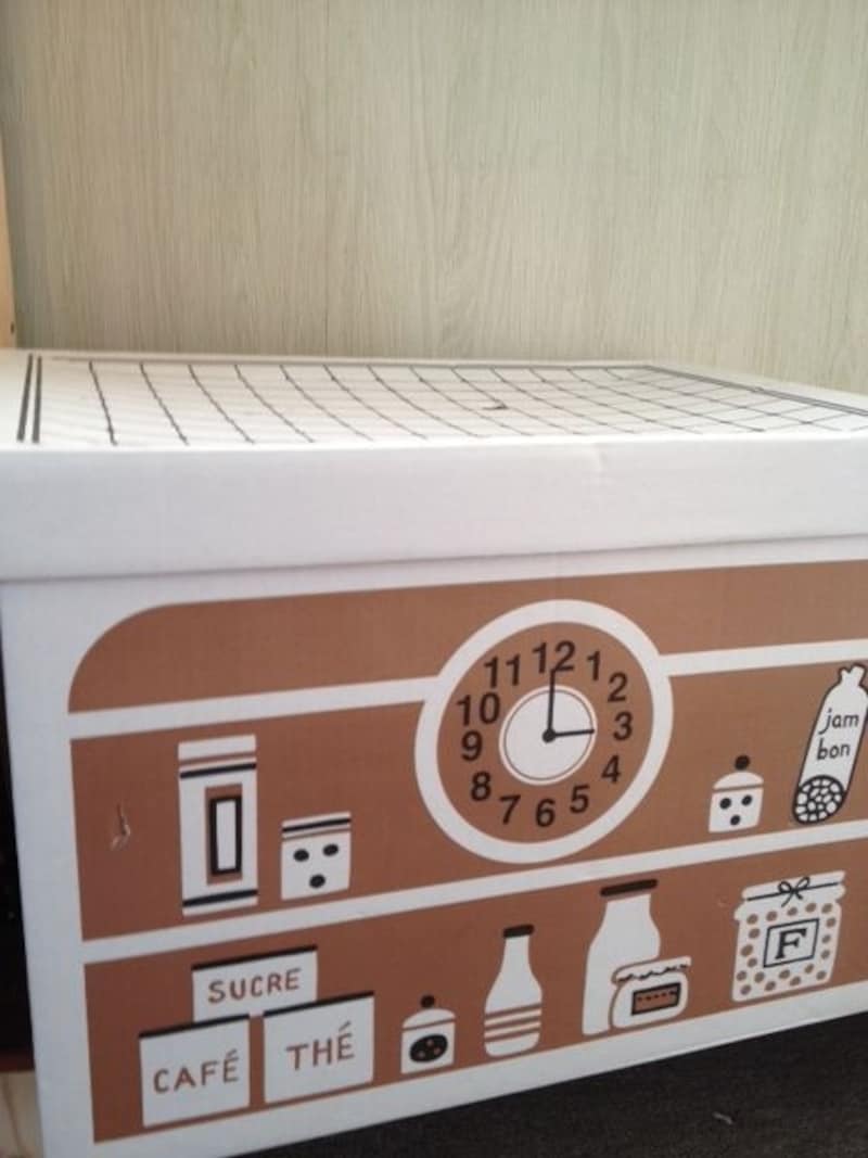 時計と食器棚をモチーフにしたイラストがかわいい収納ボックスです。蓋がついていて、造りもしっかりしていて、積み重ねも可能です。我が家では子供のおままごとキッチンを上に乗せ、この箱には普段あまり開けない手芸用のストック布などを収納しています(最初はおままごと道具を入れようと思ったのですが、この木製コンロはけっこう重さがあって子供一人で上げ下ろしが難しかったのです……)。