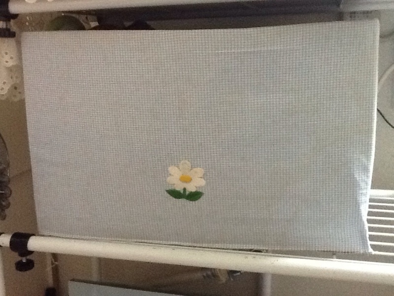洗濯機収納棚に置いてあるオリジナル収納BOXです。自分の気に入った柄のBOXを見つけることができなかったので、ダンボールを棚に入る大きさに合わせて形を作り、大好きなブルーのギンガムチェックの生地を木工用ボンドで貼り付け、マーガレットのお花のアップリケを付けたBOXを作りました。