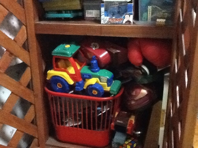 子供が小さい時は、鍵を開けっ放しにして使用しておりました。ポタジェの中に、赤いバスケットを入れ、パトカーやトラックの大きめの車のおもちゃを入れて収納したり。子供用のボクシングセットのように、形が定まらない物を、この中に入れて収納しております。