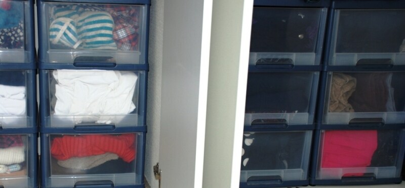 時季外れの衣類を収納しておく、クローゼットの衣類収納ボックスといえば、フタの両サイドに留め具の付いた、プラスチック製の衣類用クリアーケースが一般的かと思いますが、我が家のクローゼットには引き出しタイプの衣類収納ケースしかありません。一年中のすべての衣類を引き出しタイプの収納ケースにしたことで、衣替えをしなくて済むようになりました。また、初夏でも「ちょっと肌寒いな」、秋口でも「まだ暑いな」ということで、衣替えをして、フタ付の収納ボックスにしっかりしまった後でも、季節の変わり目は気温が不安定だったりします。
