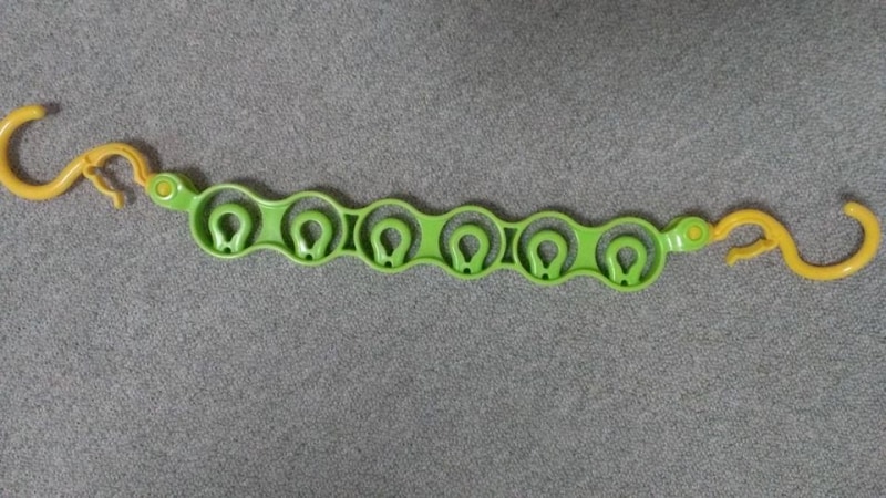 洋服をハンガーにかけてクローゼットに収納していると1枚1枚が重なり、洋服が増えるにつれて次第に幅をとるようになります。身近なものを使用して少しでも多く洋服を収納できるようにしたいと思い、100円ショップに行ったところ、画像のようなモノを発見しました。