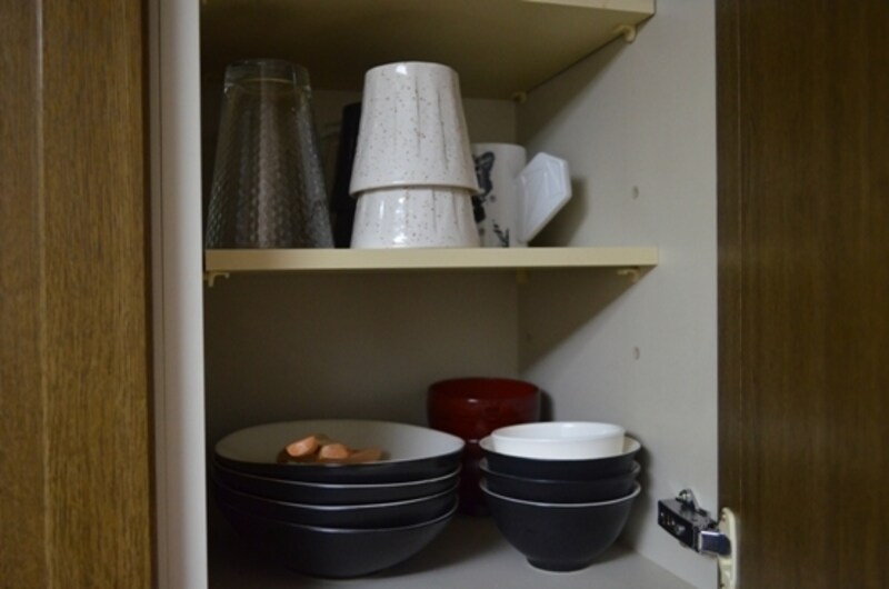 食器は必要最低限のもので揃えています。収納場所は、キッチンに備え付けの流し台上部の戸棚です。よく使う食器を手前に置き、同じお皿は積み重ねて置いています。その奥の空いているスペースには普段使わないタッパウェアーなどを置くようにしています。