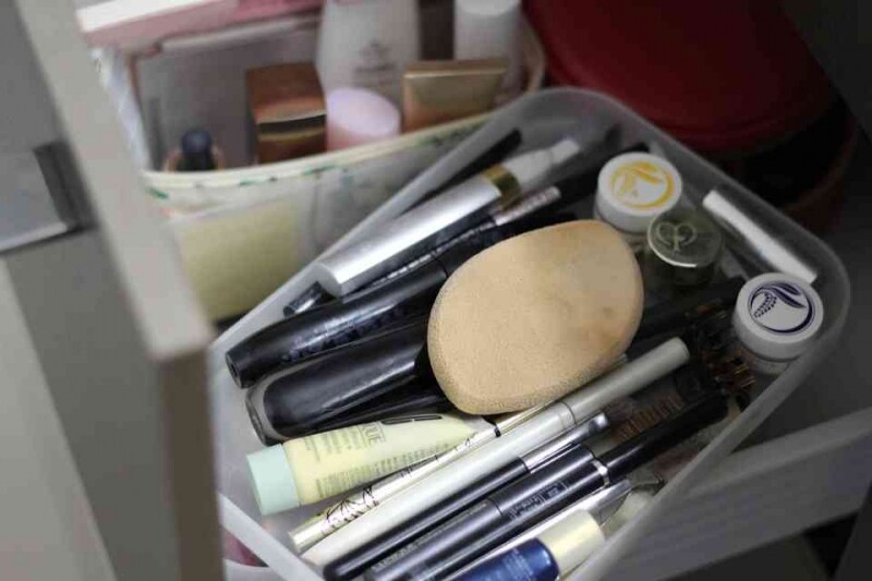 引出しに、無印良品のポリプロピレンでできたメイクボックスとトレイを置いて2段にして収納しています。下にはアイカラーやファンデーション、チークやブラシが入っていて、上にはマスカラやアイライン、パフなどが入っています。収納はざっくりなので、上の段は雑然としてしまっているのが申し訳ないですが……。最近ではこんな感じです。