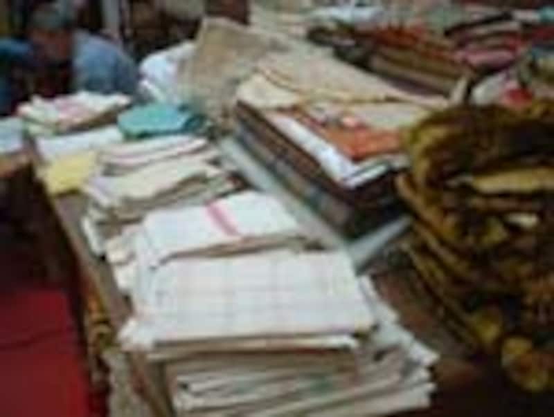 たくさん並べられた古いクロス類。 汚いのもあるので、よくチェック。 |
