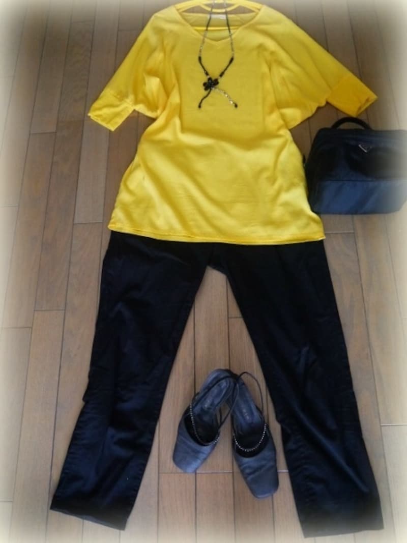 こちらは、海や高原等のリゾートモードのコーディネートと言うよりは、街の中を歩く時のイメージで合わせてみました。トップスにかなり華やかな色味のイエローチュニックを持って来ていますので、ボリュームネックレスはブラック×ダイヤモンドシルバーのカラーストーンのものをセレクト。